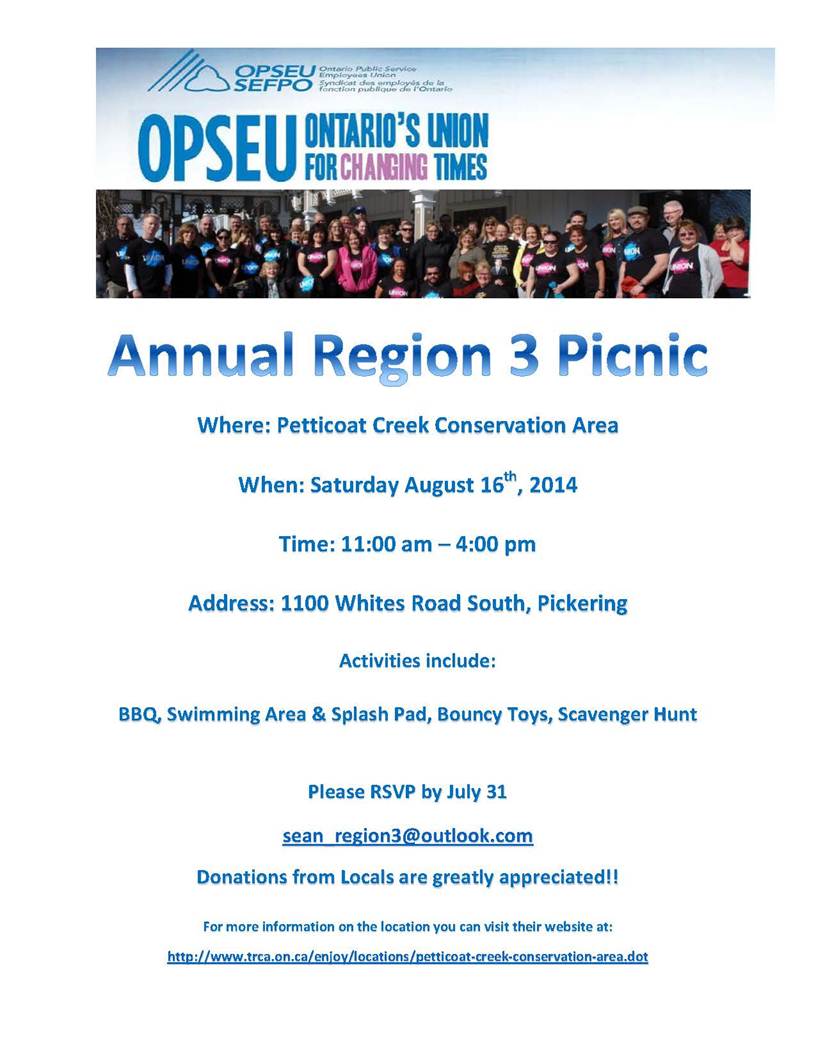Annual Region 3 picnic We ask that you please RSVP by July 31st with the number of tickets you require including how many children (14 and Under) and how many adults(15 and up) Tickets will be emailed to you once numbers are confirmed. If anyone is unable to email their request please feel free to contact Sean Platt directly at 905-376-4909 to make other arrangements.